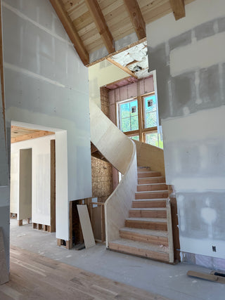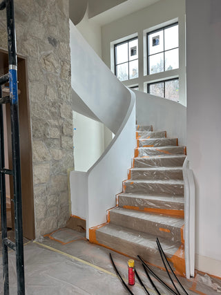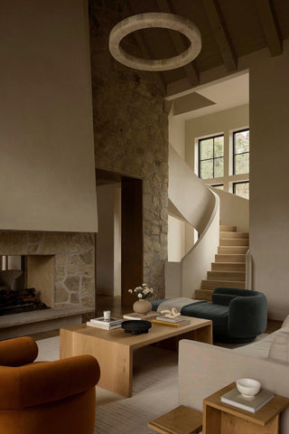 Wrapped in Alpine Veil—a serene taupe-crème lime plaster—the spiral stairs and soaring fireplace hood feel sculpted from light, creating calm within grandeur.